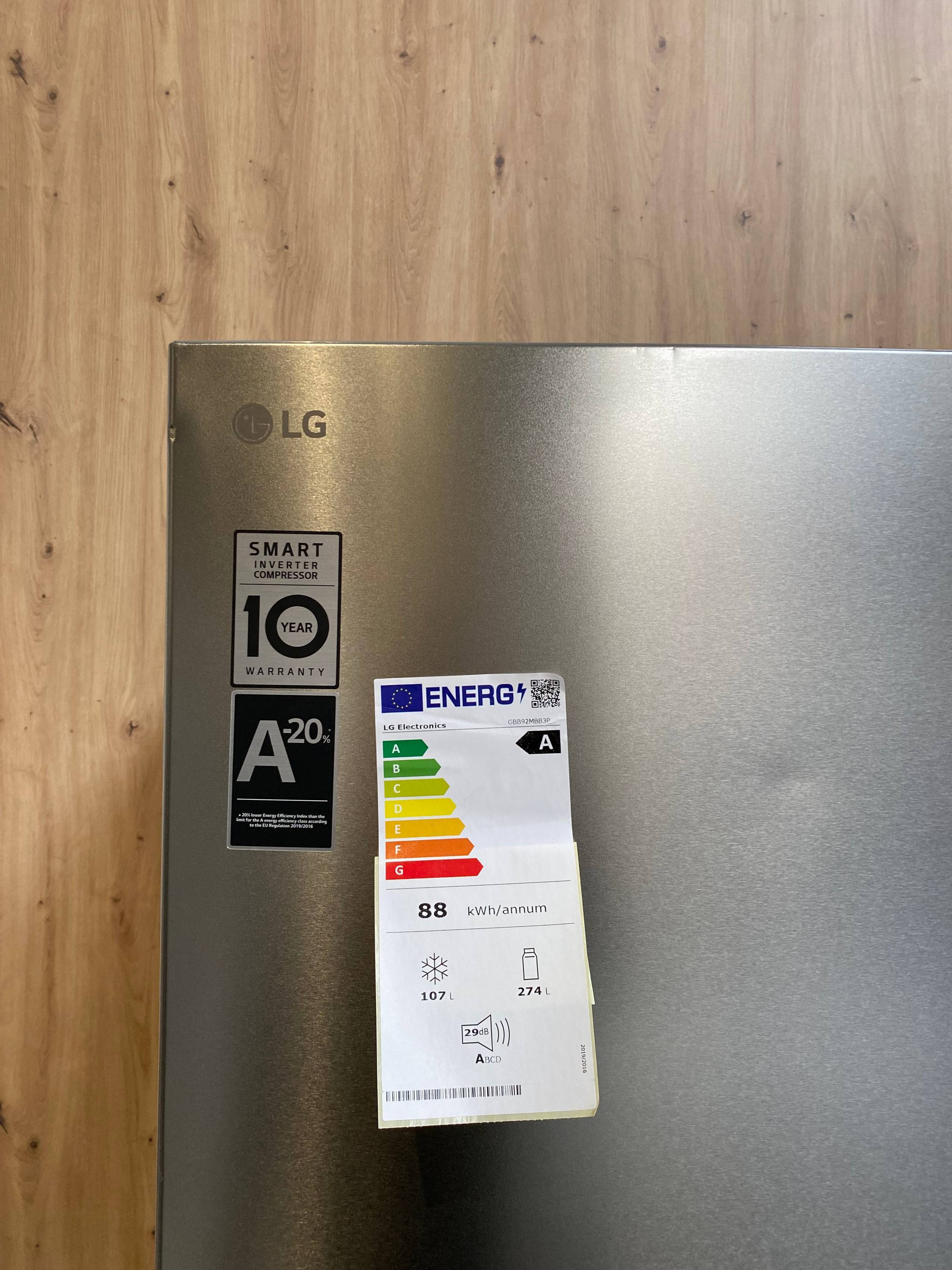 Model LG GBB92MBB3P zużywa zaledwie 88 kWh energii rocznie, co czyni go jednym z najbardziej efektywnych urządzeń w swojej klasie. Smart Inverter Compressor automatycznie dostosowuje moc chłodzenia, zapewniając niezawodne działanie i 10-letnią gwarancję.