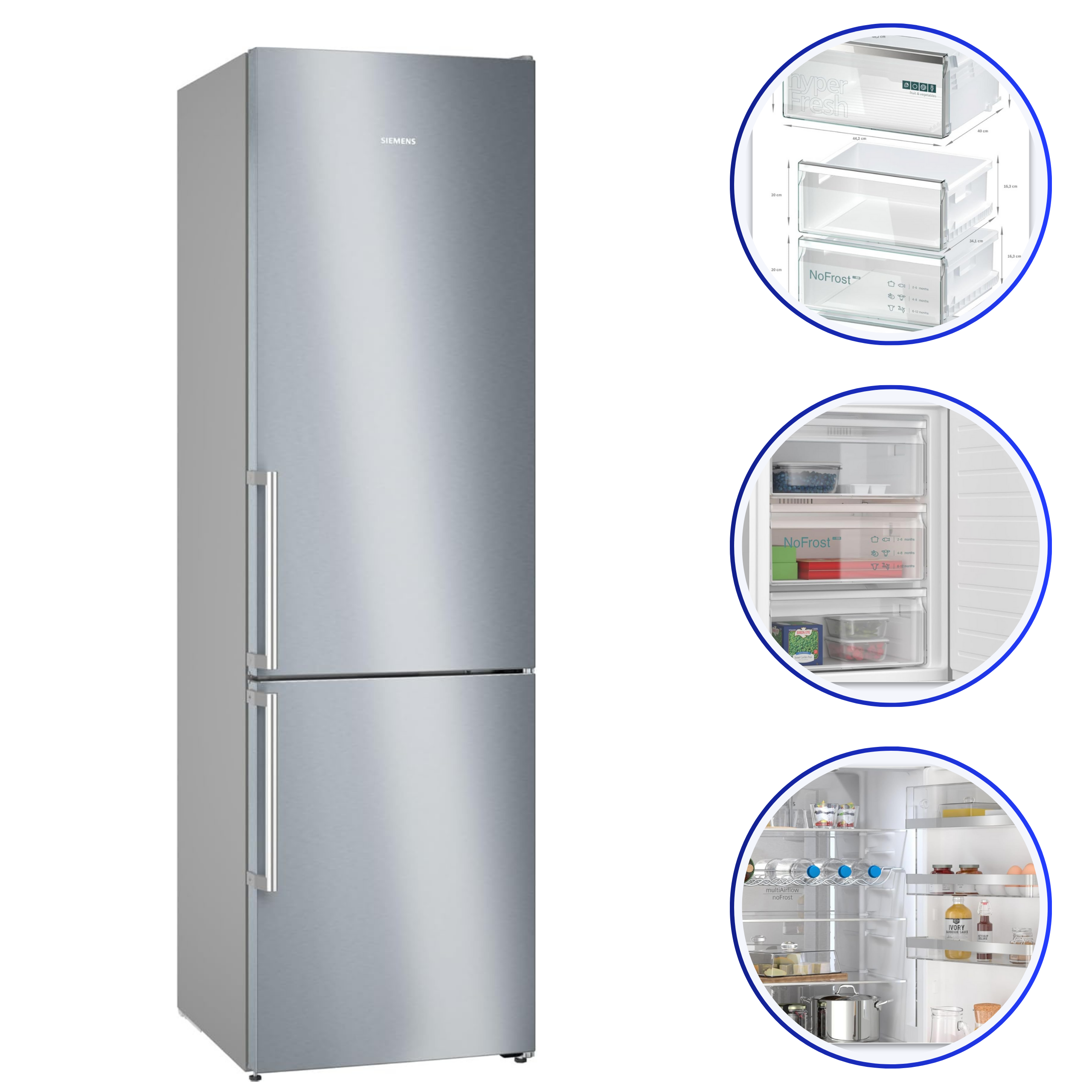 Lodówka Siemens KG39NAIAT z serii iQ500 to wolnostojące urządzenie o wysokości 203 cm, które oferuje całkowitą pojemność 363 l (260 l chłodziarka + 103 l zamrażarka). Dzięki technologii No Frost nie musisz już martwić się o ręczne rozmrażanie, a system hyperFresh dba o świeżość warzyw, owoców, mięsa i ryb nawet 2 razy dłużej.