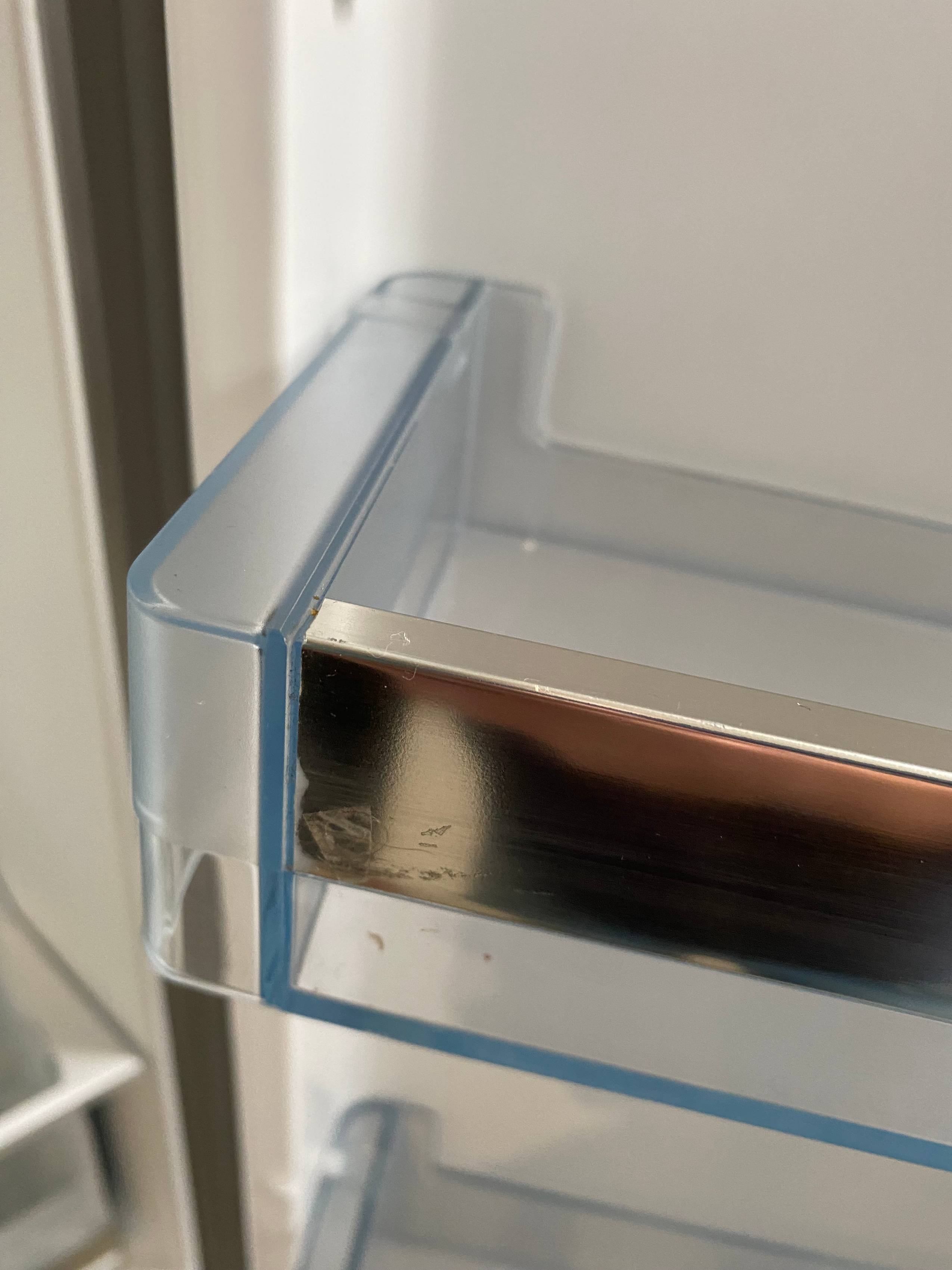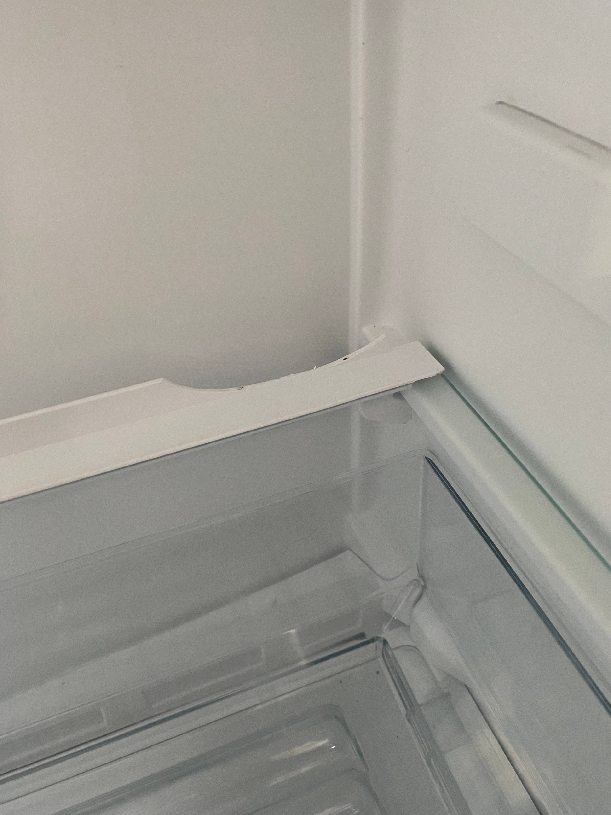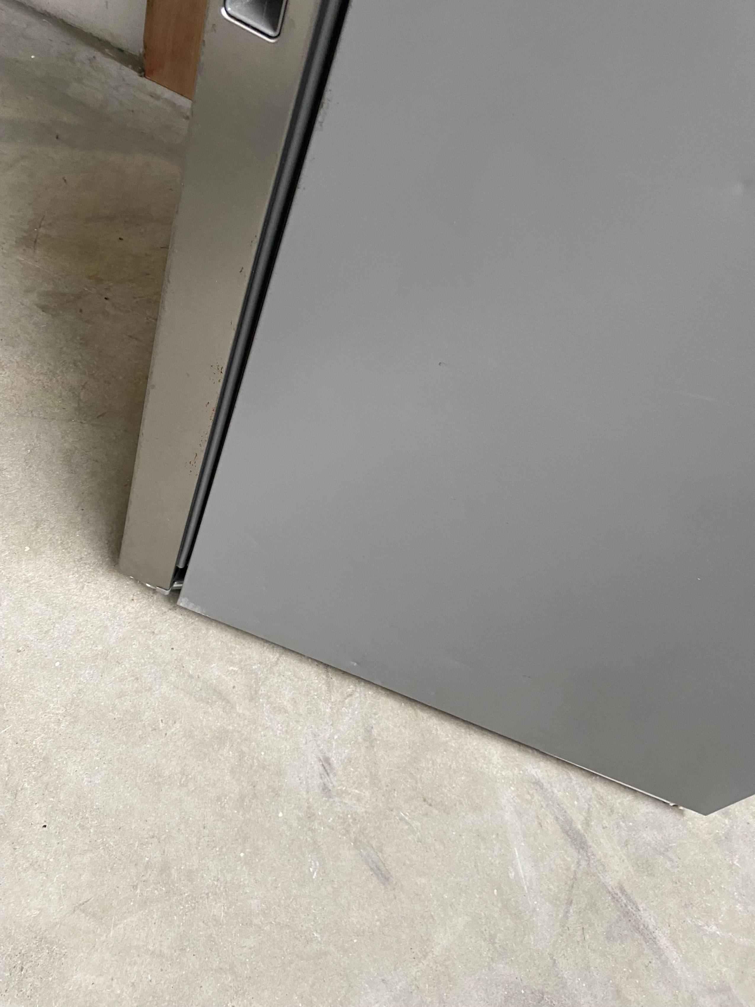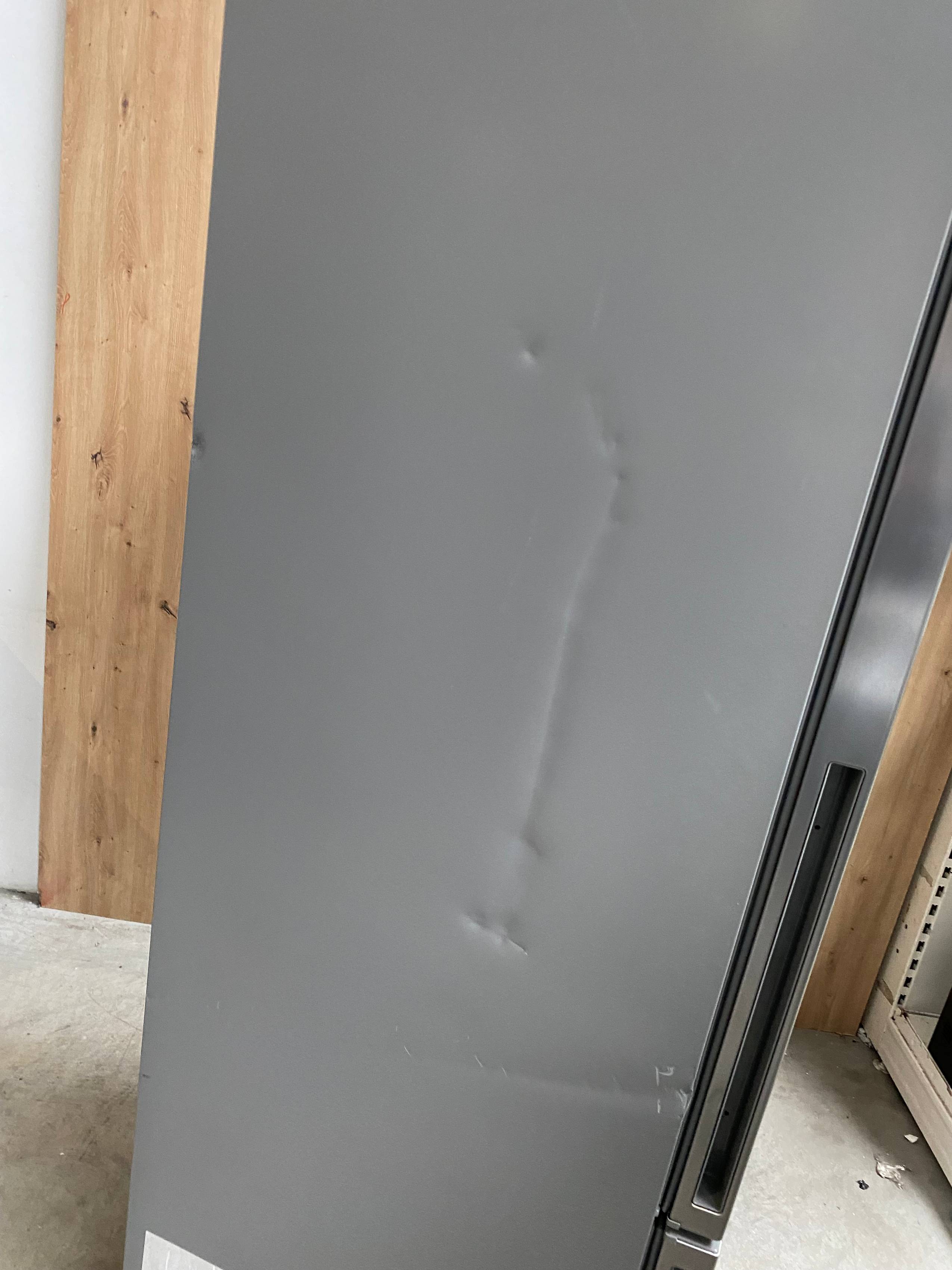 Defekty i uwagi: wgniecenia i zarysowania na bokach froncie, pęknięcie plastikowej osłonki półki, wgniecenie na lewym boku przy otwarciu drzwi