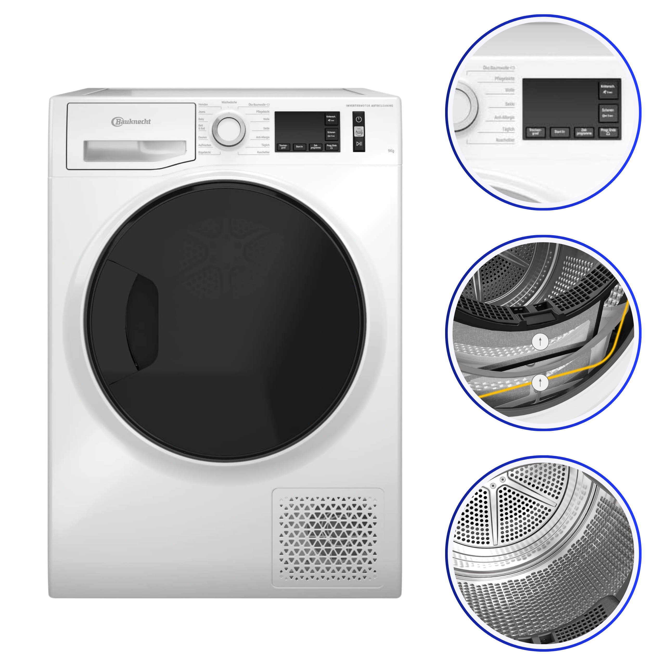 Model Bauknecht T M11 9X3EY DE to wydajna suszarka kondensacyjna z pompą ciepła o pojemności 9 kg, która dba o tkaniny i zmniejsza zużycie energii. Dzięki technologii ActiveCare ubrania są chronione przed zniszczeniem, a AutoCleaning kondensatora eliminuje konieczność ręcznego czyszczenia.