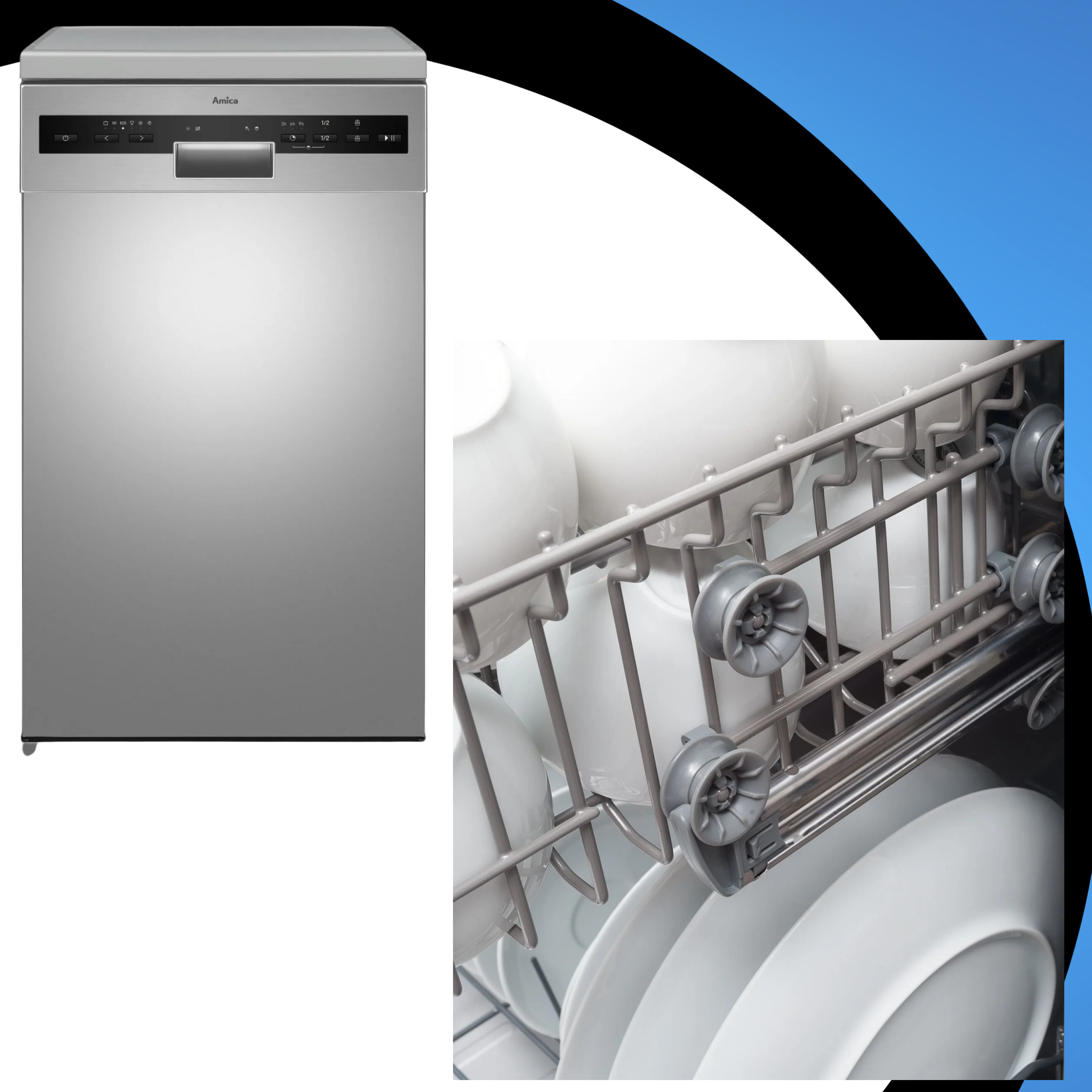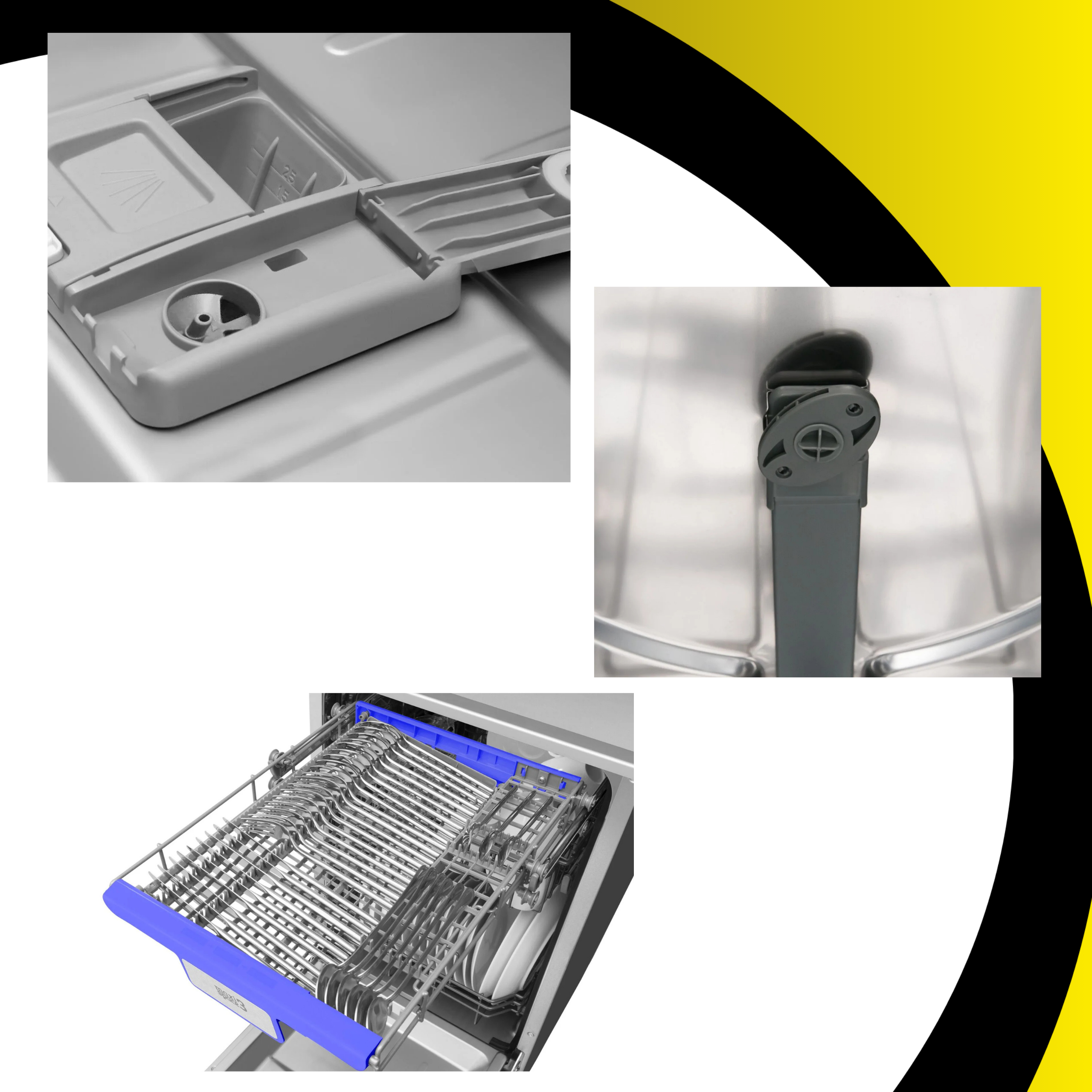 - Składane uchwyty na naczynia w dolnym koszu: Tak